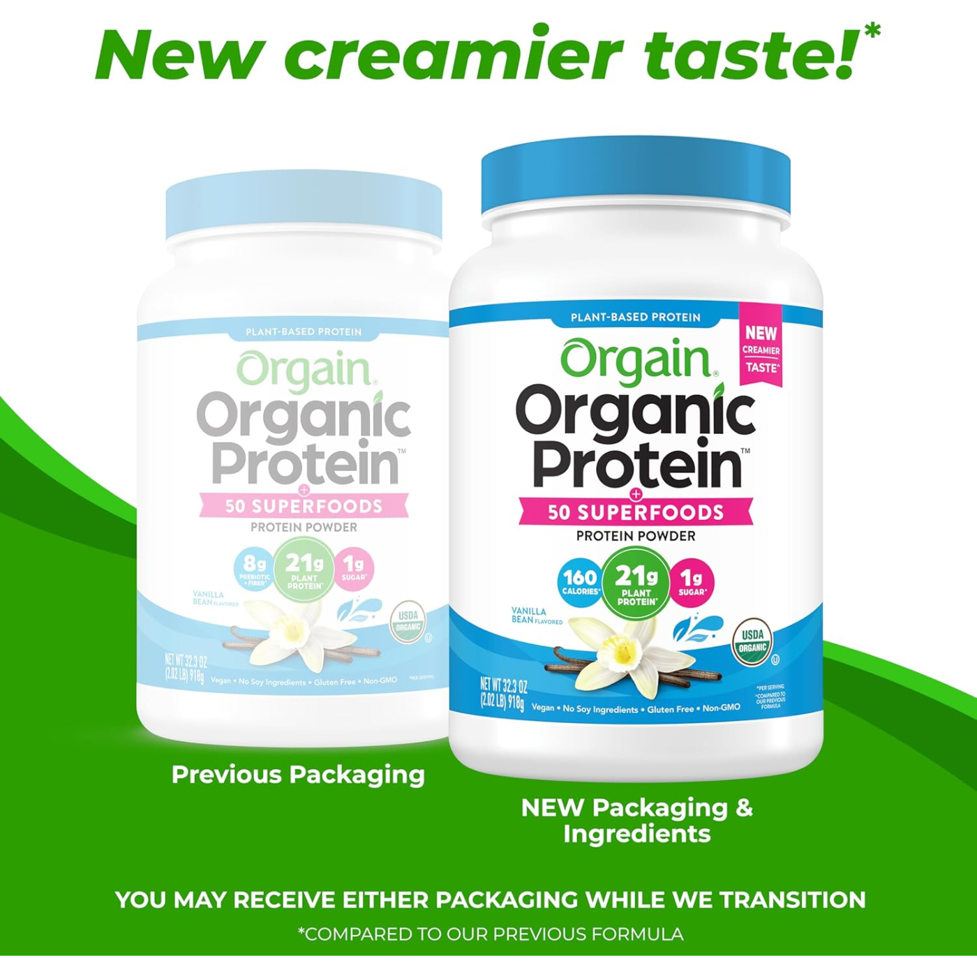 Orgain Organic Vegan Protein + 50 Superfoods Powder, Vanilla Bean - 21g Plant Based Protein, 8g Prebiotic Fiber, No Lactose Ingredients, Gluten Free, No Added Sugar, Non-GMO, 2.02 lb
