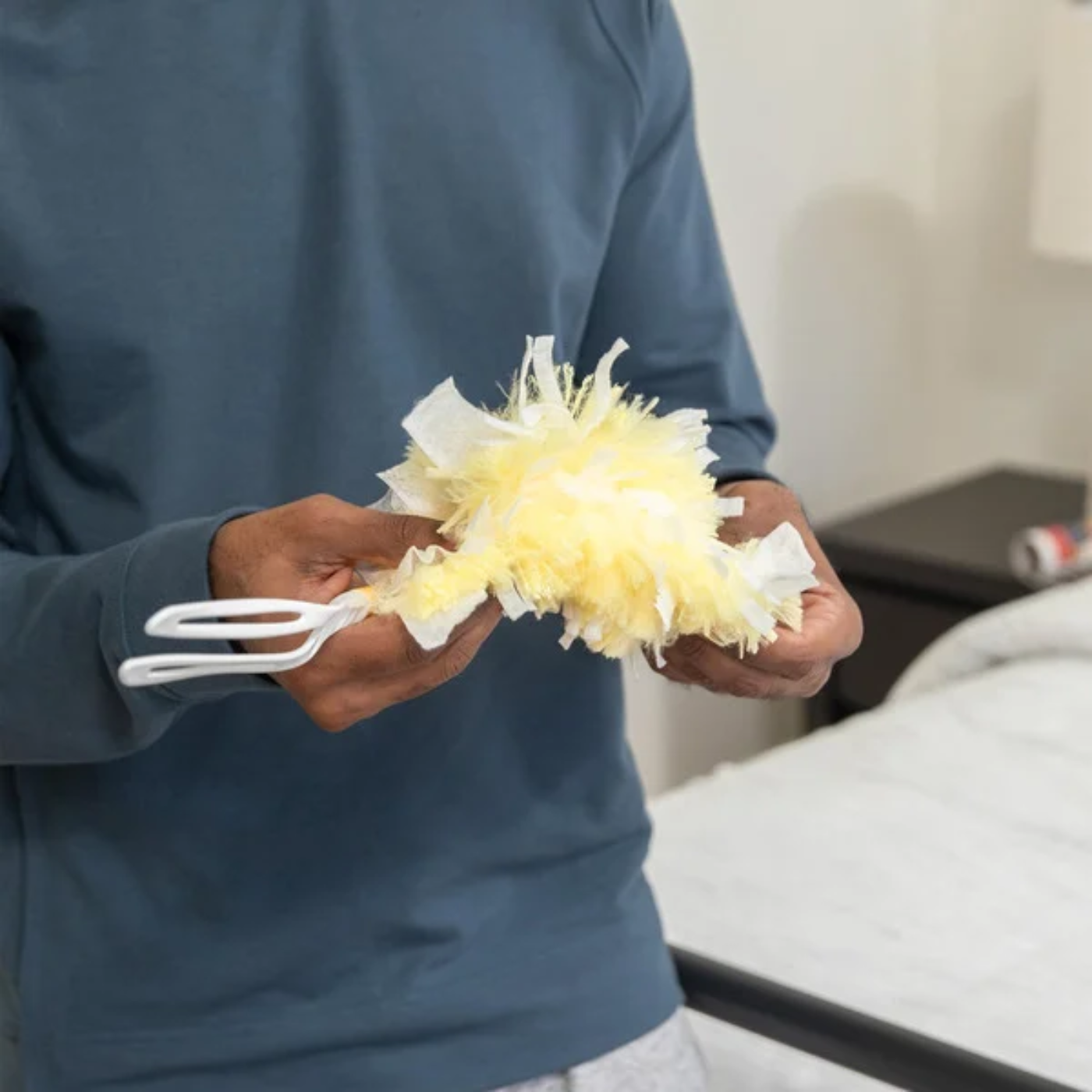 Double-sided duster cloth captures dust, dirt, and hair